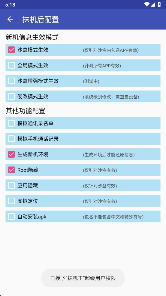• 在抹机前配置中勾选清理系统变量,抹机后配置建议选择沙盒增强模式。