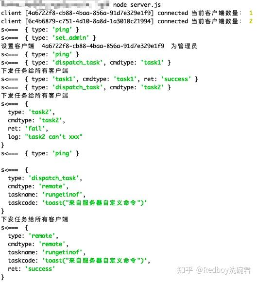 通过websocket实现客户端和服务器全双工通信,客户端连接后,服务器端可以通过websocket push方式给连接的客户端下发指令,另外管理端一般是web,这里也可以通过起个webserver方式进行管理端操作,也可以将管理端视为客户端的一员,标记为管理端,只有管理端可以操作下发指令。管理控制端基于时间原因就没有写web页面,直接用websocket测试页面下发任务,具体看运行效果图。