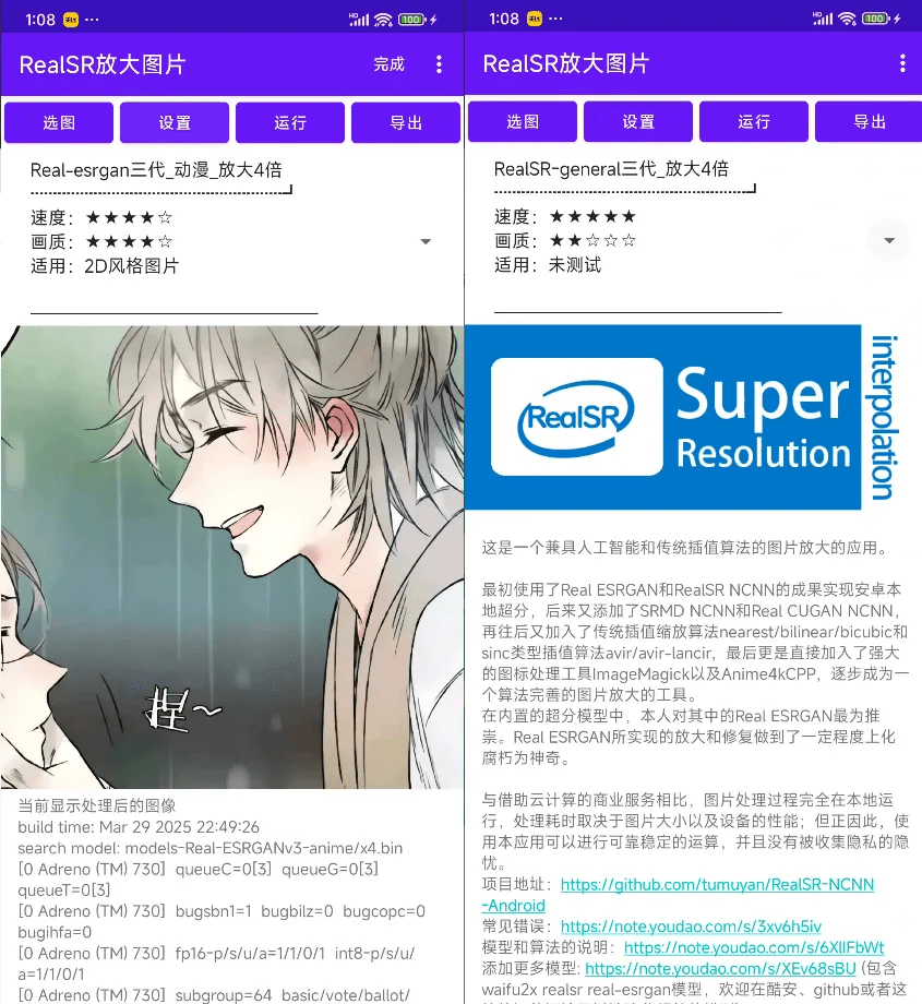 而且是将电脑上用的 Real-ESRGAN,RealSR, Real-CUGAN 和 SRMD 超分辨率模型带到了安卓平台