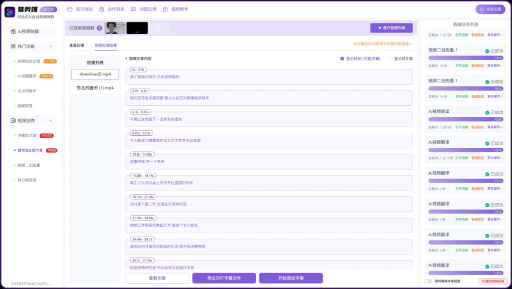 - 新增 加字幕&提文案,批量提取,含时间区间,可选择是否加成视频字幕。