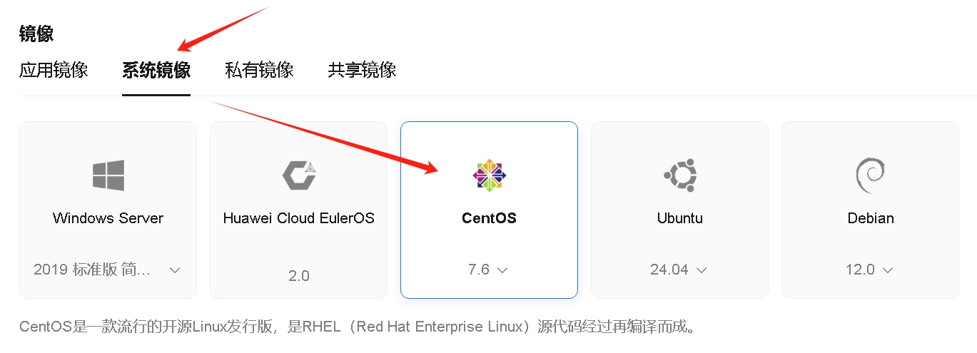 二、选择服务器配置(选择centos系列服务器,7.6、8等等系列):