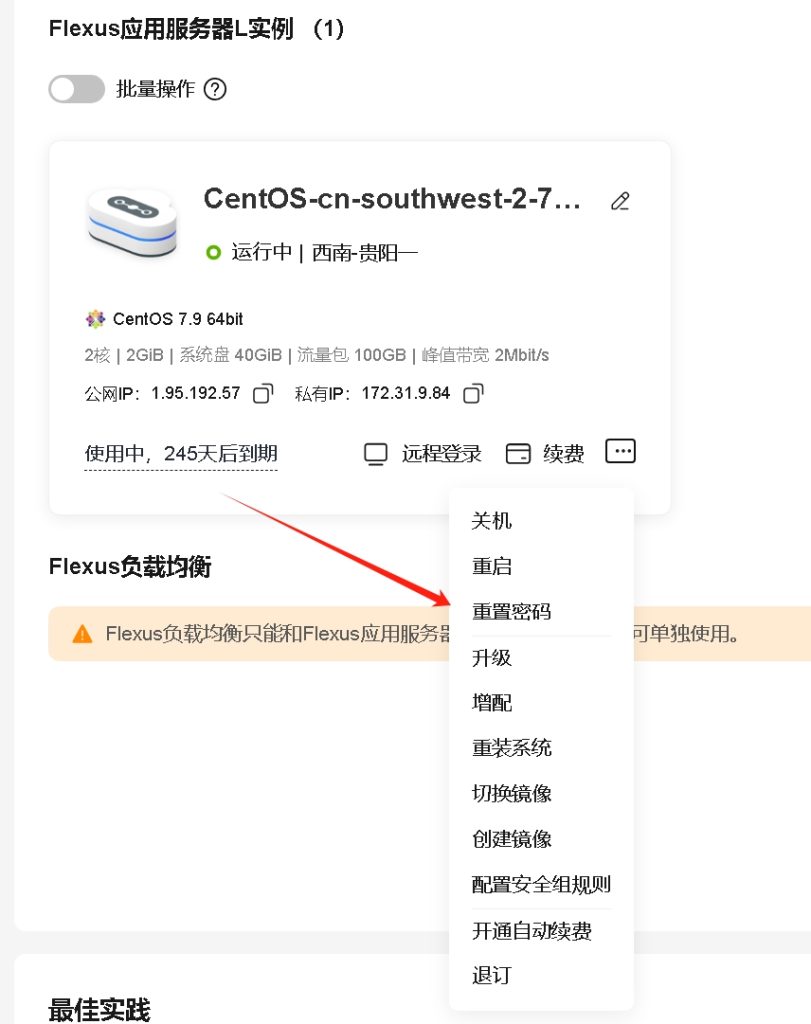 找到服务器的界面,找到服务器修改密码(新服务器未设置密码,不能进入控制界面)