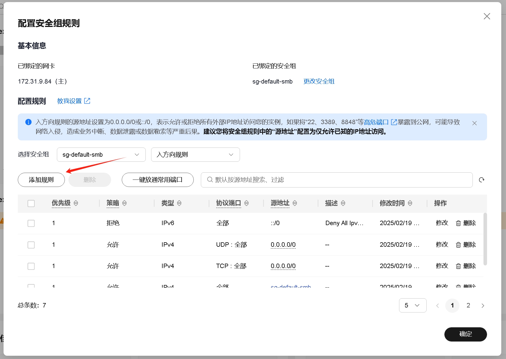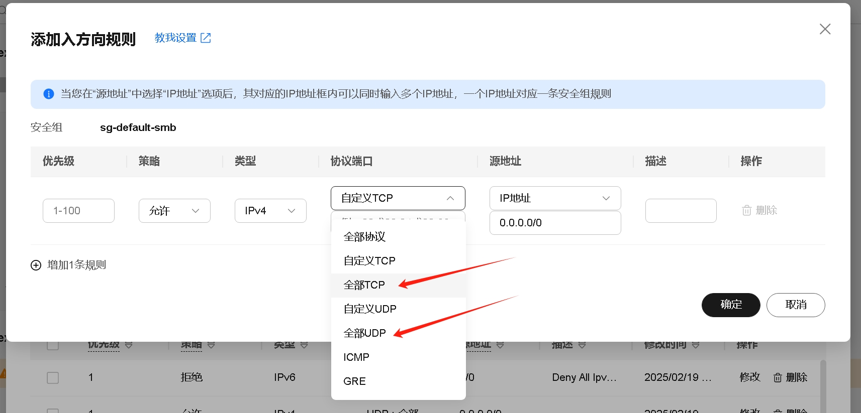 添加规则,并选择全部tcp和全部udp