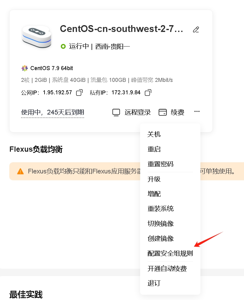 找到服务器的界面,找到服务器配置安全组规则(新服务器需开放安全组,端口未开放无法进入)