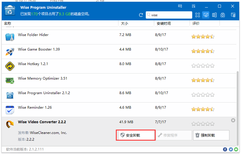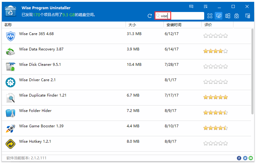 Wise Program Uninstaller 默认用程序的首字母递增的方式对应用程序排序,你可以通过鼠标滚轮向下滚动查找程序,也可以在搜索框中输入程序名字快速定位。也可以按安装时间排序,卸载那些早期安装的但是没有使用的程序,还可以按大小排序,卸载那些体积超大的程序,释放更多磁盘空间。