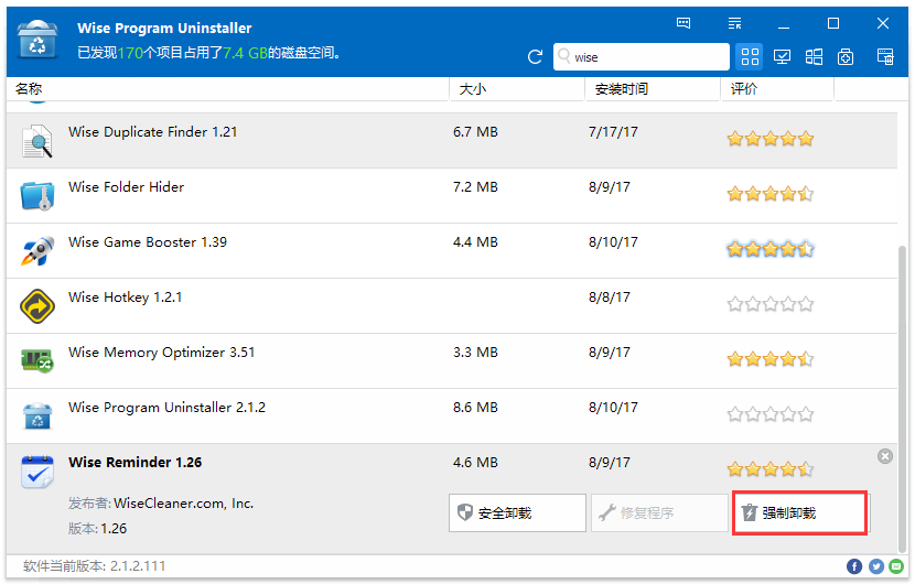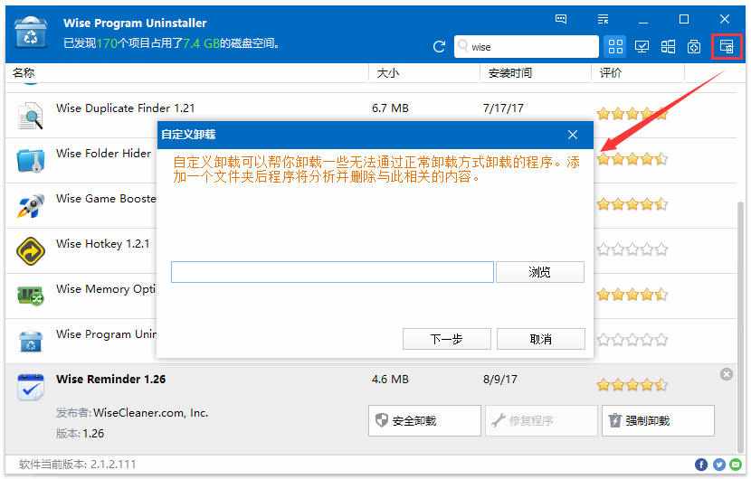 Wise Program Uninstaller 还提供2中特殊的卸载方式,强制卸载和自定义卸载。